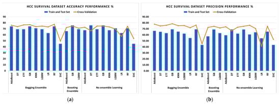 In the HCC Survival dataset, the main attributes identified included AFP (alpha-fetoprotein), hemoglobin (hemoglobin), ALP (alkaline phosphatase), and albumin (albumin). With train and test split, DT without ensemble achieved the best performance in accuracy (75.81%), precision (68.97%), f1-score (72.33%), and roc_auc (75.96%), whereas SVC exhibited the best results in recall (100.00%). Regarding precision, RF and GB with the bagging ensemble yielded the best performance (69.23%). On the other hand, when using k-fold cross-validation with the bagging ensemble, RF exhibited the highest score in accuracy (77.45%), GB in precision (78.45%), roc-auc (84.98%), and AdaBoost in f1-score (78.59%). SVC exhibited the best performance with no ensemble in recall (99.23%).