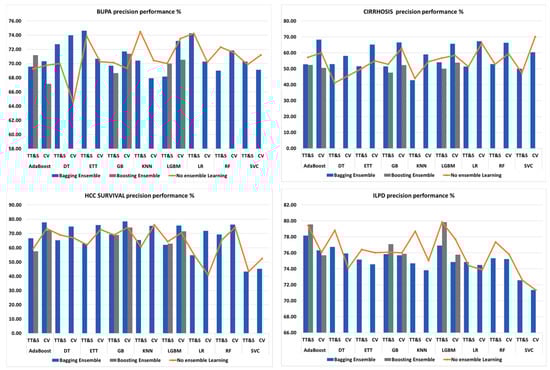 Concerning the precision metrics, Figure 8 shows that the classifiers adequately performed for all the top four attribute classifications. Additionally, we found that when working with the BUPA and the HCC Survival datasets, the classifiers performed better in precision when using the bagging ensemble, whereas, in the ILPD, the classifiers performed much better with the boosting ensemble. On the other hand, when dealing with the non-ensemble method on the datasets, we achieved better classifier performance results on the ILPD and the HCC Survival dataset. As for the best-evaluated technique, train-and-test split validation worked best on the BUPA dataset, the CPD, and the ILPD. On the other hand, on the HCC Survival dataset, some algorithms performed better when using train-and-test split with the boosting ensemble, whereas some others worked best when using both the bagging ensemble and the non-ensemble models.
