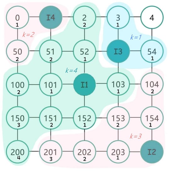 The figure illustrates four green agents, denoted as , , and , which correspond to central investors. Each agent is the center of a cluster with the same background color, denoted as . The four clusters have different k-hop scopes. The distance between each agent within a cluster and its respective central investor is indicated below the agent number.