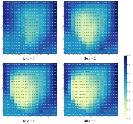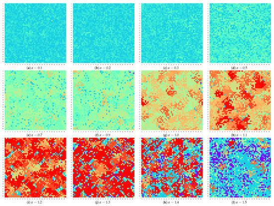 In Figure 10a–f, the subgraphs display nearly uniform colors when a takes a small value, such as . Conversely, when a increases, such as , the subgraphs Figure 10h–k exhibit a polarization phenomenon, characterized by the concurrent existence of dark red and dark blue colors within the same subgraphs. Finally, as a continues to increase, dark red clusters nearly disappear in Figure 10i. The phenomena above can be observed to occur within three distinct intervals of aspirations a. When a is within a small range, central investors possess almost the same level of utility. Nonetheless, as a continues to increase to a middle level, the network gets populated with highly- and lowly-utility agents concurrently. Finally, when a increases to a larger range, highly-utility agents decline, while the lowly-utility agents dominate the network.