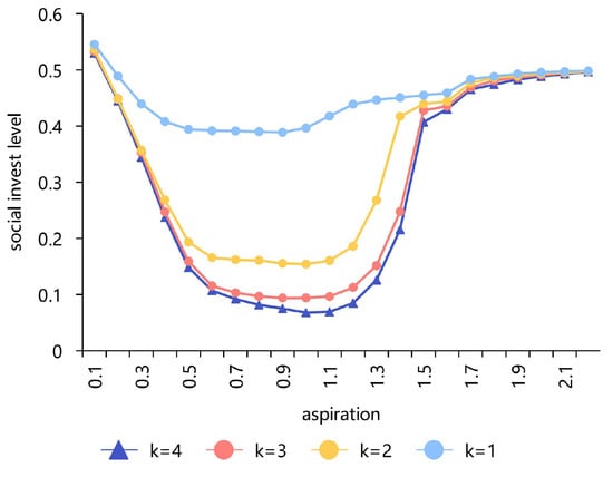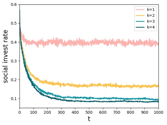 Secondly, the social invest level starts to rise at this time because of the emergence of , , leading to the instability of the central investors’ strategies and the occurrence of Association. The degree of association in different values of k can be reflected by . Table 3 indicates that as a increases, so does the number of associated agents. This results in an increase in the number of strategies shifting from non-investing to investing. Consequently, the level of social investment increases.