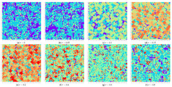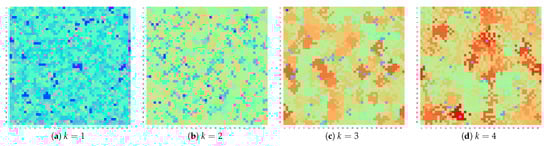 A heat map displaying the utilities of all agents does not clearly reveal the strategic relationships between them. Thus, we focus on clusters as the unit of analysis, with the utilities of the central investors serving as a proxy for the cluster’s utility. This allows us to compare yields across clusters and observe strategy relationships within each cluster. Based on that, we create lattice network snapshots (Figure 4) for various k values at time step when the investment rate is numerically stable. It is observed that a decrease in k leads to a lower utility for central investors and a smaller cluster size with scattered distribution, particularly in subgraph Figure 4a. Conversely, an increase in k leads to a higher utility for central investors and a larger cluster size with blocky distribution, particularly in subgraph Figure 4b–d, which illustrate the process of morphological change from scattered distribution to blocky distribution. It is evident that Figure 4b has assumed a cloud-like shape in contrast to Figure 4a. Within each cluster, the utility of a free rider depends entirely on the central investor. It is worth considering how the surrounding free rider agents will adjust their strategies if the central investors alter their strategies.
