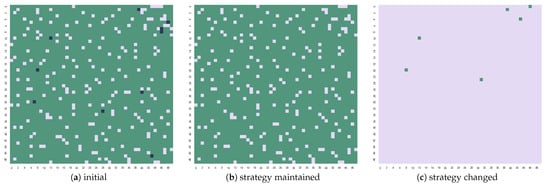 Firstly, we interpret the reason for the central investors’ utility polarization. At this time, free riders can realize their aspirations. They will therefore stick to their strategies with high probabilities. However, the comparison between central investors’ utility and aspiration a mainly depends on . Central investors who have a vast number of visitors, denoted as , can achieve a high level of performance () that exceeds a. In these cases, their clusters are generally stable, with a high probability rate, as shown by the dark red blocks in Figure 10. Conversely, central investors who have fewer visitors, denoted as , are likely to experience a utility level () that is lower than a. This type of occurrence is represented by the dark blue blocks in Figure 10, and the coexistence of agents with high and low utility is the primary cause of utility polarization.