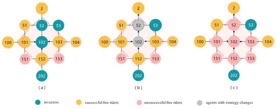 In the network, (a,c) act as partial agents with their respective strategies at and + 1. At + 1, (b) reflects the altered strategies of (a,c) from . Green nodes represent the investing agents, yellow nodes indicate successful free riders, red nodes depict unsuccessful free riders, and gray nodes signify strategy changers. The arrows show the sequence of free riding, beginning with free riders and concluding with investors. Fixed parameters: , , .