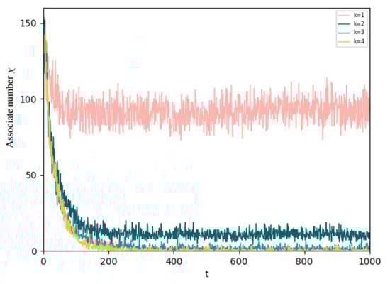 The degree of association in different values of k can be reflected by . Figure 7 illustrates the variation of the number of associated agents in different k over the simulation. The number of associated agents decreases more rapidly as k increases, with the number sinking from 150. At , there are still approximately 100 associated agents, but at they almost vanish. In conclusion, a smaller k results in a greater number of agents being associated in the network, and it is necessary to further investigate the reason for this result.
