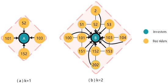 Then, we aim to explain the relationship between k and Association. Figure 8a depicts the scenario where A is the central investor. Given , only agents 52, 101, 103, and 152 can connect to A. Therefore, A’s maximum utility is . In Figure 8b, B is the central investor, and given that , there are at most 12 agents surrounding B. Hence, B’s maximal utility is . It is evident that (a = 1.5), while . Accordingly, A is more likely to alter its strategy and associate with all adjacent agents, while B has a higher tendency to preserve its current investment plan. Therefore, an increase in k enhances the stability of the central investor, thereby reducing the likelihood of Association and promoting the social investment level, which is the general conclusion. Equation (5) illustrates the general case, where the value of k determines the magnitude of . Hence, a larger k leads to a bigger , thereby promoting . Therefore, central investors with aspiration a are highly probable to retain their investment strategies.