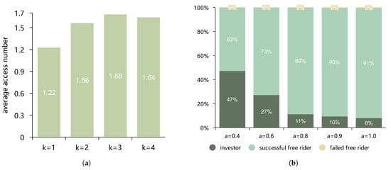 Figure 10a–f depicts the phenomenon of the average utility of central investors for k = 4 when a takes a small value. We hypothesize that similar situations would occur when k = 1, 2, and 3. As the utility of central investors surpasses a, it leads to the insignificance of k regarding the impact on the access number . To support this claim, we present the average access number of investors by successful free riders at different values of k, while holding , , and , as illustrated in Figure 11a. Direct evidence, provided by Figure 11a and supporting our assertion, is provided by the maintenance of the access number of the investors between 1 and 2, irrespective of the value of k.