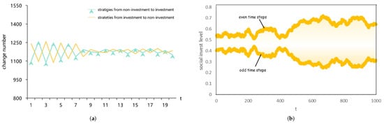 Subgraph (a) shows the number of strategy-changing agents in the first 20 simulations, where the green line represents those changing to invest, and the yellow line represents those changing to non-invest. Fixed parameters: , , . Subgraph (b) shows the average social invest level of 1000 simulations. The line above represents the social invest level corresponding to an even number of time steps. The line below represents the social invest level corresponding to an odd number of time steps. Fixed parameter: , , .