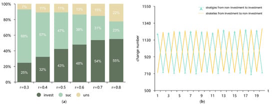 - If r can still meet the condition that , investors keep their strategy with high possibility. So at this time, it is the strategy change by the free riders that contributes to the increase of social invest level. In Figure 15a, the number of successful free riders decreases with the increase of r, while the number of investors increases. This indicates that the surrounding free riders are gradually separating from the central investor due to the increasing access costs, and their strategy change to invest.