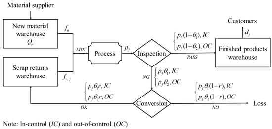 - Consider a production line that is not perfect and that produces multiple products, with the availability of process maintenance. For simplicity, we first establish a production–inventory model with two products. The production cost and materials used for the two products are the same, and the materials used are a mixture of new materials and scrap returns. Figure 1 illustrates a schematic process of the production line.