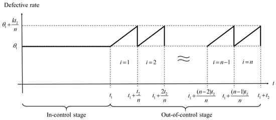 Figure 2. The change in defective rate during a cycle. - It is assumed that the feed rates of scrap returns for two products are different and that they satisfy the inequality, . Generally, product 1 and product 2 are arranged for manufacture in the in-control and out-of-control stages, respectively. In the in-control stage, the feed rate of scrap returns must be less than the recovery rate to avoid a lack of scrap returns, i.e., . On the contrary, the feed rate of scrap returns should exceed the recovery rate to avoid an unrestricted accumulation of scrap returns in the out-of-control stage, i.e., . Consequently, the inequality, , is held, which implies the recovery rate, .