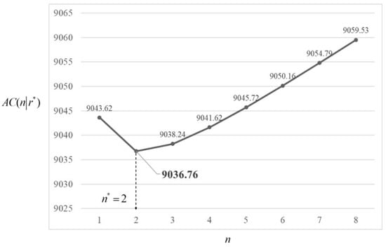 The primary objective of this study is to determine the optimal production, maintenance, and investment strategies to achieve minimal total cost per unit. Equation (3) shows that the value of the depends on and ; hence, the total cost function can be reduced to . Because is a positive integer, we first explore the objective under the given number of maintenance times, i.e., . According to the first-derivative test, we observe the pattern of during . Under the is a convex function of ; if , increases during . This implies that the investment of recovery equipment would not be beneficial because the larger value for results in a higher value of . Therefore, the optimal recovery rate is . If , and the recovery rate can be increased to , which satisfies . For the number of maintenance times, we can observe the effect of increasing the times on the value of to determine the optimal times. Based on the above results, Figure 4 plots a simple algorithm procedure for finding the optimal solution in which the is an accuracy of solution . In summary, because the proposed model is a nonlinear integer programming problem with the high-power expression of the polynomial function, it is difficult to provide a theoretical proof to verify the optimal solution. Instead, this study tries to use numerical analysis to verify the convexity of the total cost function.