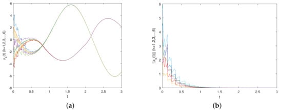 The non-delay and delayed activation functions are . It is clear that Assumption 1 holds when . Let , , , and . A simple calculation gives that , and the maximum eigenvalue of matrix is . Hence, the above parameters guarantee all the requirements in Corollary 1 are fulfilled. The initial states of fractional-order single-link network Equation (37) are randomly selected within the interval . Under the hybrid impulsive control schemes, the simulation results of and in Equation (37) are given in Figure 2a,b. The abscissa in the figure also stands for the system’s evolution time. Figure 2a indicates that the two-dimensional state vectors of all network nodes tend to converge to a completely consistent state over control time. Figure 2b indicates that the error norm of all network nodes gradually approaches zero as the control duration increases. Figure 2 shows that single-link neural network Equation (37) can achieve asymptotical synchronization under the proposed hybrid control schemes, which validates Corollary 1.
