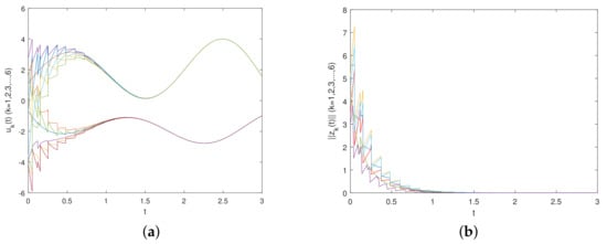 The non-delay and delayed activation functions are . It is clear that Assumption 1 holds when . Let , , , and . A simple calculation gives that , and the maximum eigenvalue of matrix is . Consequently, the above parameters fulfill all the requirements in Theorem 1. The initial values of multi-link network Equation (36) are randomly chosen within the real interval . Utilizing the hybrid impulsive control methods, the time evolution processes of and can be seen in Figure 1a,b under the above control parameters. The horizontal ordinate in the figure represents the system’s evolution time. Figure 1a displays that the two dimension states of vectors of all neurons tend to converge to completely consistent states over time. Figure 1b displays that the error norm of neurons gradually approaches zero as the control duration increases. Based on the definition of global synchronization, Figure 1 shows that the controlled multi-link network can achieve global asymptotical synchronization, which means the theoretical analysis of Theorem 1 is correct.