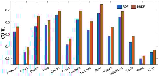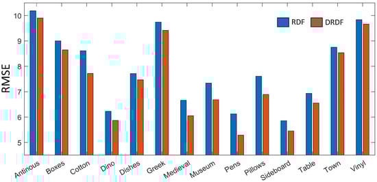 First, we analyzed the performances of RDF and DRDF on all 14 synthetic datasets. RDF and DRDF, having the same filter size (), were applied to all datasets to compute the focus volumes. The depth maps were estimated by taking the image number with the best focus measure in the optical direction. Without applying any enhancement method or post-processing of the focus volume or initial depth maps, RMSE and CORR measures were calculated with reference to the GTs. Figure 3 and Figure 4 show the RMSE and CORR metrics, respectively. From the figures, it can be observed that the DRDF has shown a reasonable improvement for all datasets compared to the RDF. The depth maps computed for all synthetic objects from the DRDF provided lower RMSE and higher CORR in relation to their GTs. This indicates the effectiveness of the proposed focus measure.