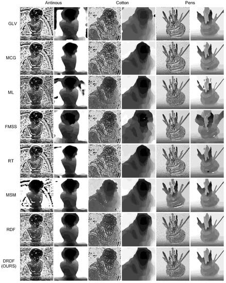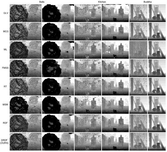 For real datasets, we constructed depth maps of Balls, Kitchen, and Buddha as shown in Figure 6. The first column of each dataset represents the initial unaggregated depth maps while the second column represents the cost-aggregated depth maps. The Balls dataset consists of 25 images, each with a resolution of 640 × 360. In the unaggregated depth maps, MSM produced the most smoothest depth map followed by ML while others tried to show detailed texture of the objects present in the dataset. However, when aggregated, ML produced a blurry depth map as it failed to capture the extra details in the objects, FMSS misrepresented the objects and their boundaries, and GLV produced some black patches. While RDF, RT, and DRDF performed better than others, MCG and MSM produced the best results with the fewest black patches and the best edge detection. The Kitchen dataset, comprising of 11 images with a resolution of , did not provide much detail on the generated depth maps due to the limited number of images. In the unaggregated depth maps, MCG showed the noisiest background, followed by RDF and RT. However, after the aggregation, GLV had some unusual black patches, ML showed white patches in some objects, FMSS distorted the shapes of the objects, MSM merged two objects together, giving them the same depth values and RT produced small visible white patches in the depth map. MCG, RDF, and DRDF were among the best-performing methods, but MCG had a visible white dot in the object shape, which indicates inaccurate depth estimates. In addition, RDF showed some discontinuities in-depth maps, which also indicates imprecise depth values, while DRDF provided smoother depth maps, which indicates a better perception of depth values. Finally, the Buddha dataset, consisting of 29 images with varying focus settings, and a resolution of 768 × 768 pixels, showed that ML produced the noisiest depth map in the unaggregated state, followed by RDF and DRDF. However, after the aggregation, DRDF performed the best. FMSS distorted the shapes of the objects; RT and MCG showed white dots inside the depth map, which stipulates inaccuracies. ML provided a false perception of depth in some areas. GLV, MSM, RDF, and DRDF were among the better-performing methods for this dataset; however, GLV, MSM, and RDF incorporated a white dot inside the object in the depth map when examined closely. In contrast, DRDF reduced the white dot, which indicates a reduction in the discontinuities and an improved depth map.