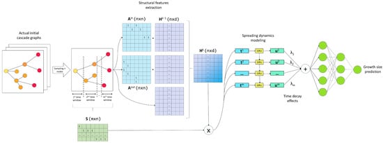 Temporal features of spreading (mean arriving time [], mean reaction time [], evolving patterns [], etc.) are also considered valuable in popularity prediction. For example, Ref. [] finds a strong relationship between the cascade’s early popularity and its final popularity. Ref. [] indicates the existence of a log-norm distribution in users’ reactions to a new post tweet. Additionally, some researchers modeling users’ retweet/sharing time series also find the rich-get-richer and the time decay effect in cascades’ evolving patterns [,]. Even in the medical field, temporal features are used to build deep learning models for virus transmission prediction []. Since there is much evidence for the effect of a cascade’s dynamics as well as its initial structural features on future popularity, our model must make predictions by combining both features.