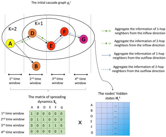In general, the current GNNs can be divided into two categories according to convolution approaches: the spectra methods and spatial methods. In a spectra method, the convolution operation is defined in the Fourier domain by computing the eigendecomposition of the graph Laplacian []. However, the Fourier domain’s convolution is unintuitive for people seeking to understand which features the model captures from data. In contrast, the spatial method operates convolution directly following information diffusion paths [], which is also in accord with the real cascade evolution. Moreover, the spectral convolution is inflexible for large cascade learning as it usually requires the computing of the Laplacian of the whole graph, while the spatial convolution can be combined with the node sampling method to efficiently handle those oversize cascade graphs.
