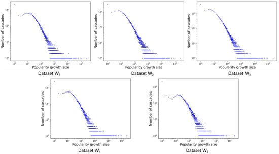 The dataset used in our research is the Sina Weibo retweet dataset, which is generated by [] and is widely used in recent popularity prediction studies [,,] as well. This dataset records the diffusion paths in 24 h of 119,313 original micro-blogs that were posted on 1 June 2016. In addition, the exact timing of each user’s retweet is also included in this dataset, allowing our model to capture the dynamic features of spreading. Because the spread dynamics are different between day and night, we follow [,] and filter out micro-blogs posted before 6:00 AM or after 18:00. Moreover, according to previous experiments [,,], the length of the observation time window (i.e., the time duration t after posting) can significantly influence models’ performances, and the proportion of small cascades that have little future growth in the dataset may also affect the model’s overall prediction errors. Therefore, to comprehensively test the performance of ViralGCN, we construct five sub-datasets based on different observation times and initial cascade sizes. Specifically, the observation time in , , is, respectively, 1 h, 2 h, and 3 h after posting, and the micro-blogs with an initial cascade size no less than 10 are selected. and include the micro-blogs with an initial cascade size of no less than 20 and 30, respectively, and both observation times are 3 h after posting. The statistics are reported in Table 3. Moreover, in this study, the retweet popularity of a micro-blog within 24 h after origination is regarded as its final popularity. Thus, the actual growth size of cascade c is computed as , where t is the observation time. Figure 4 shows the distribution of popularity growth of all five datasets.