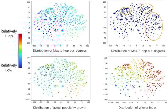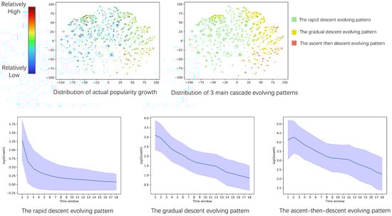 Except for spatial cascade convolutional layers, another core component of the proposed ViralGCN is the temporal information aggregation layer, which is used to extract the dynamic features of online viral spread. To explain what ViralGCN learns through the temporal information aggregation layer and how the learned temporal features affect the popularity growth, we first try to figure out what the different types of evolving patterns are in the early stage of online viral spread. Hence, we adopt the K-means method to cluster the 3859 micro-blogs in the test dataset of based on the spreading dynamics during the observation time window, i.e., h after origination. As a result, three early evolving patterns of viral spread are identified from the test dataset of , as shown in the bottom of Figure 8, where the x-axis is the divided time windows and the y-axis is the log of retweet popularity growth, the blue line is the mean value, and the top and bottom shades are pluses or minus one standard deviation, respectively. We call the left one the rapid descent evolving pattern, whose retweet popularity is relatively lower than the other two patterns initially and declines rapidly over time. The middle one is called the gradual descent evolving pattern, which makes relatively higher popularity initially than the rapid descent pattern and declines gradually over time. The last one is called the ascent-then-descent evolving pattern, from which not only a relatively high initial popularity but also a remarkable rise at the second time window can be seen. Additionally, the retweet popularity of the ascent-then-descent evolving pattern declines gradually as well. After this, we color the projected cascades by their early evolving pattern in the top right of Figure 8 to investigate the effects of different early evolving patterns on future popularity growth. Compared with the distribution of actual popularity growth, it is obvious that the cascades with the gradual descent or ascent-then-descent evolving patterns are more likely to gain relatively larger popularity growth in the future.