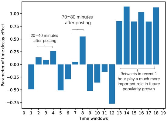 In the temporal information aggregation layer, ViralGCN adopts several trainable parameters to learn the time decay effect of each time window. To investigate whether the time decay effects can be learned by ViralGCN and how the time decay effects influence popularity prediction, we plot the learned of each time window as a bar chart in Figure 9. According to the absolute value of the learned , it can be seen that the height of bars increases with the time window number, suggesting that the more recent retweets are more valuable for predictions. In other words, the proposed ViralGCN is capable of learning the time decay effects of online viral spread. In addition, we also find that some of the learned is less than 0. The results explain that the timings of retweets may have different effects on future popularity growth. Since the length of the time window is 10 min, the results of learned imply that the retweets within 20–40 min and 70–80 min after posing, as well as the last 1 h before observation time, can make positive contributions for future popularity growth.