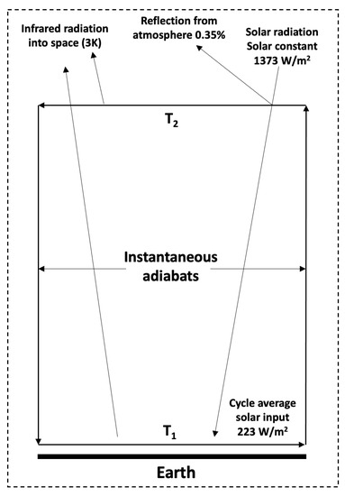 Simplified schema proposed by the GZ diagram of a cyclic heat engine driven by solar energy, the heat input is the solar radiation per area , and the working fluid is the atmosphere. In contrast, the work output is the maximum wind energy. The model can obtain maximum and minimum temperatures of the atmosphere without considering any other effect on the Earth apart from the one already described in the convective cell [20].