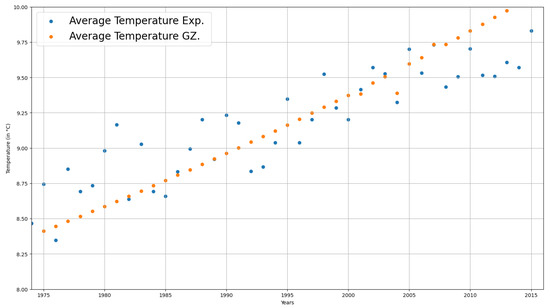 On the other hand, the points of our previously mentioned modeling of the GZM would seem to show the same linear trend, so in Table 2, two comparisons were made, taking into account a linear regression with LR and an analysis obtained directly from our modeling with GZM. As a result, we obtained a difference between the analysis with LR and GZM. This is explained considering that the temperature observations only recorded points in our vector. In contrast, the modeling records these points, and the physical information of the atmosphere is saved, as well as the thermodynamic variables of the system, which gives us results of the mean temperature increase with more value than those obtained by an analysis of experimental points.
