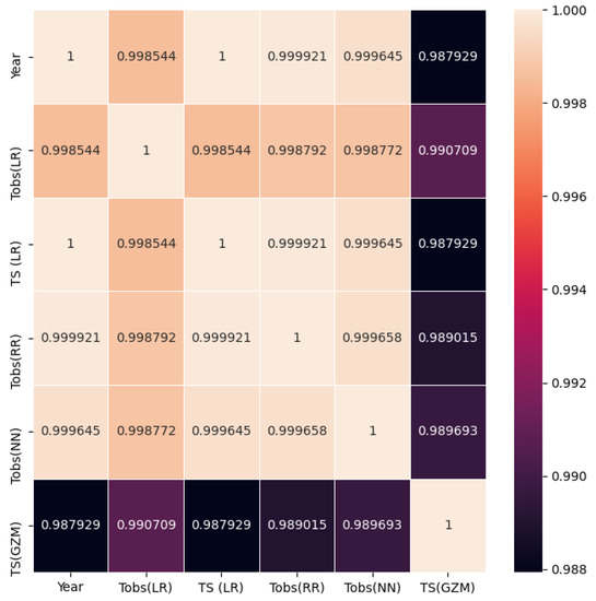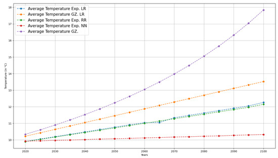 Moreover, Figure 4 shows a plot of the predictions made from the experimental data and the modeling of the GZM system. It is important to note that in future scenarios with forecasting by GZM, the average temperature is higher than that obtained by the data of the evolution of the observed temperatures from various machine learning techniques. Nevertheless, the rate of temperature increase is in the range per decade, according to [29]. The plot shows that the temperature evolution in the case of the construction of an ANN, LR, and RR grows in a widespread gradual way compared with our proposed model. The GZM model saves the atmosphere’s physical characteristics, such as entropic relationships, radiation conditions, and irradiance. It helps to present more realistic behavior in the data, unlike the other forecasting, which only shows us a regression of the linear type without considering the evolution of the physical parameters caused by the alterations in the Earth’s atmosphere.