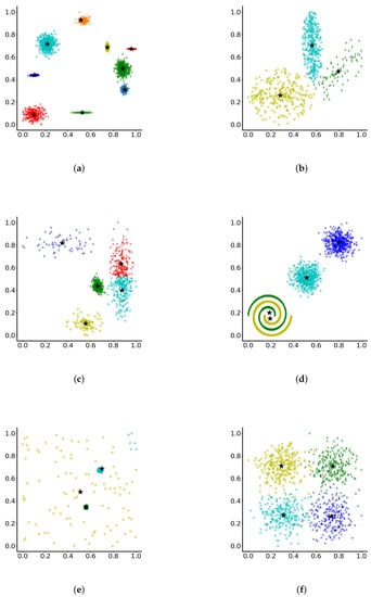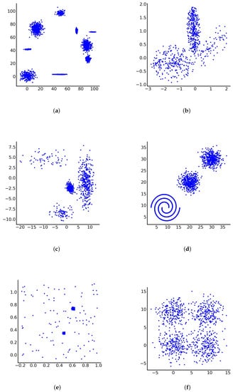- Data set (f) (“square2” in [36]) contains shapes with fuzzy boundaries. This data set helps evaluate the algorithm’s efficiency and effectiveness in scenarios with complex and densely distributed clusters.