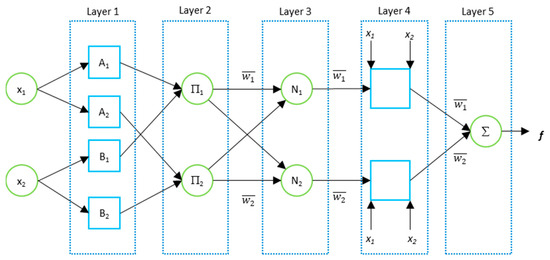 - Layer 1: Fuzzification layer—it is assumed that node has an adaptive function as: , where is the output of node i, while denotes the MF.