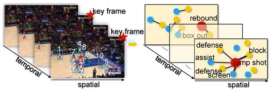 Group activity recognition (GAR) focuses on classifying the activity of a crowd of people working together in a video clip. It is a central topic in many domains, such as sports video analysis [1,2], CCTV surveillance [3,4,5], sports tactics [6], and social scenario understanding [7,8,9]. To comprehend the multi-player scenario, the model needs to recognize the individual actions and the group activity. Differing from general individual action recognition, GAR requires the deep and precise learning of spatio-temporal interactions between actors, which entails challenges such as the dynamics of actors and the complexity of their underlying correlations. It is expected to embed latent relations between actors from the spatial and temporal perspectives. Thanks to the graph convolutional network (GCN), this paper designs an effective Spatio-Temporal Attention-Based Graph Convolution Network (STAB-GCN) model for GAR.