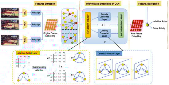 Given these actor features, we construct multiple actor relation graphs to embed latent relationships. In the graphs, every node denotes an actor in a multiple-person scenario and every edge denotes a relation between pairwise actors. The weight of every node denotes the relationship strength according to relative actors’ appearance features and coordinate positions. Then, inferring and embedding in the GCN consists of X identical blocks, which include an attention-guided layer, a densely connected layer, and a combination embedding layer. The attention-guided layer mainly transforms multiple actor graphs into n fully connected weighted graphs and corresponding adjacency matrices by utilizing spatio-temporal attention, which further ensures no loss of latent valuable spatio-temporal relation information for GAR. Moreover, the attention-guided layer further highlights the spatio-temporal dependencies of different graph convolution features. Then, n adjacency matrices are input into n densely connected layers to produce a novel spatio-temporal embedding that is subsequently fed into a combination embedding layer and combined to generate the final feature embedding.