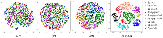 As shown in Figure 3, we considered the t-SNE [40] visualization of group activity feature embedding on the NBA dataset. (1) FC: we only use FC layers instead of STAB-GCN. (2) SA: we use only a spatial attention mechanism. (3) STA: we use a spatio-temporal attention mechanism. (4) STAB-GCN: we use the spatio-temporal-based GCN. Specifically, we transform the group activity representation into a two-dimensional map based on t-SNE. The feature embedding from STAB-GCN can be clustered more effectively compared with FC, SA, and STA. The results show that our STAB-GCN is suitable for the recognition of group activity.