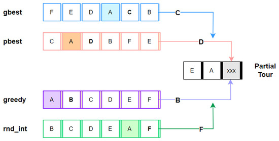 Due to the very constrained graph of routes, we also suggest generating the greedy solution (shared by all the particles of the swarm) using the well-known nearest neighbour algorithm. According to this algorithm, the picker starts the tour from the I/O point and repeatedly visits the nearest location until all locations in have been visited. Indeed, due to the constraints induced by the layout on the feasible paths, this solution is known to be good, and it is thus advantageous to include it within the four reference solutions used to build a new tour. Also note that this solution never changes and remains the same from iteration = 1 to iteration = . This choice may seem rather odd, but it can be justified as follows. At the single-item level, the nearest neighbour move is certainly optimal; it is therefore useful to ensure that this move is always available when a new tour is generated in an element-by-element way. This is exactly why the greedy solution must be included in the reference solutions.