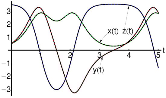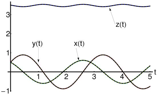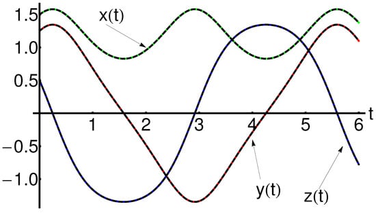 If u ¯ ( t ) is an semi-analytical solution of the problem Equations (8) and (9), then the Equations (6) and (7) provide semi-analytical closed-form solutions of the system in Equation (1) denoted by x ¯ ( t ) , y ¯ ( t ) and z ¯ ( t ) , respectively.