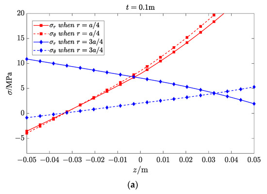 From Figure 7, the following two trends may be found. (i) The stress distribution trend of radial and circumferential stresses under different plate thicknesses is basically the same, that is, when r = a/4 (near the plate center), the differences between the radial and circumferential stresses tend to be smaller; when r = 3a/4 (near the plate edge), the differences between the radial and circumferential stresses tend to be larger, which may be due to the influence of boundary constraints. (ii) When the plate becomes thinner (t = 0.1 m), the radial and circumferential stresses both tend to be tensile, indicating that the membrane stress is dominant in thinner plates; when the plate becomes thicker (t = 0.3 m), the tensile area and compressive area appear distinct, showing that the bending stress is dominant in thicker plates. This phenomenon is also consistent with our expectations.