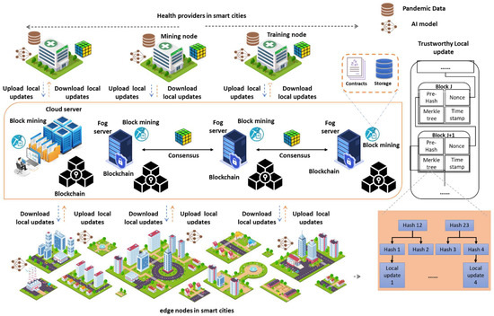 Unfortunately, the existing centralized approaches to pandemic disease diagnosis in smart cities face several challenges and limitations. First, they rely on centralized data repositories where sensitive health information is collected and saved in a single location, which poses noteworthy concerns concerning data privacy and security. Additionally, the sheer volume and velocity of data generated in smart cities can overwhelm centralized systems, causing delays and inefficiencies in diagnosis and replies to efforts [4,5]. Moreover, centralized approaches may encounter regulatory and governance matters, such as data ownership and access rights, impeding operative collaboration and information exchange among diverse stakeholders. Accordingly, smart cities are facing a pressing need for innovative solutions that leverage decentralized and privacy-preserving approaches to enhance the accuracy, efficiency, and security of pandemic disease diagnosis in smart cities [6,7].