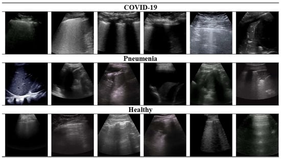Second, ICLUS-DB [2] was composed of 277 lung ultrasound (LUS) videos from 35 patients, conforming to 58,924 frames. The data were aggregated from clinical centers using a diverse range of ultrasound scanners. Both linear and convex probes were utilized, depending on which was needed. The data were collected from a total of 35 patients, comprising 17 individuals with confirmed cases of COVID-19, 4 individuals suspected of having COVID-19, and 14 healthy individuals. Furthermore, COVIDx-US [3] consisted of 242 lung ultrasound videos comprising 29,651 processed images obtained from patients diagnosed with COVID-19 infection or pneumonia, healthy individuals, and patients with other lung diseases/conditions. It also encompasses a standardized and integrated lung ultrasound score per video file, allowing for better analysis while supporting other research opportunities, such as severity judgment. The dataset was systematically managed and authorized explicitly for the intent of creating and assessing AI models. Table 1 summarizes the class distribution in the combined dataset. In Figure 2, some instances of 2D ultrasound frames of healthy, pneumonia, and COVID-19 patients are displayed in the datasets.