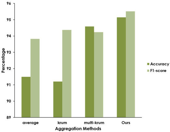 Furthermore, we compared the detection performance of our BFLPD framework under different aggregation methods, e.g., model averaging, Krum, and Multi-Krum (see Figure 5). In the case of the averaging approach, we observed that this method yielded a satisfactory detection performance, but it was susceptible to the presence of malicious clients who intentionally sent incorrect models, compromising the aggregation process and potentially leading to inaccurate results. On the other hand, we can observe that the Krum and Multi-Krum aggregation algorithms were able to mitigate the impact of malicious clients. This algorithm considered the consensus among a subset of clients, discarding outliers and focusing on the models that demonstrated the highest agreement. Interestingly, our modified aggregation algorithm significantly improved the robustness of the aggregation process and enhanced the detection performance, overcoming the influence of malicious clients and becoming a more accurate and reliable global model than Multi-Krum aggregation.