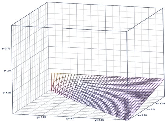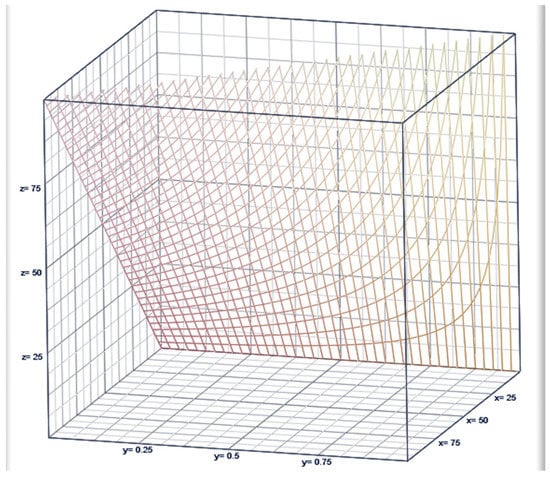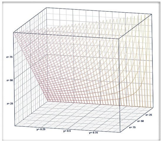 (See Figure 2, with , the ratio , and z in the x-, y-, and z-axes, respectively.) The ratio r of the incidence rate to the restriction level is indicative of their proximity to each other. The relationship of the dispersion to the ratio of expected deaths, , is inflated by the leverage factor, . In other words, when the gap between the incidence rate and the restriction level widens, the leverage factor increases to one, and this scenario is considered an effective healthcare management level of the pandemic. The dispersion (equivalently referred to as the volatility of the pandemic) would increase significantly in any level of expected COVID-19 deaths, as the leverage factor becomes smaller. Did this actually happen with respect to the number of COVID-19 deaths in US counties? This crucial question is answered in this article. For this purpose, we used the maximum likelihood estimators (MLEs) and . This means that the leverage factor’s estimate is then , which is what we are using as a complementary indexing of the public healthcare operations in the COVID-19 pandemic in the existence of volatility (that is, a level of overdispersion). This complementary indexing is opposite to that of Shanmugam et al. [1], who created and illustrated an indexing method to portray the inefficacy level of public healthcare efforts to stop the escalation of COVID-19 mortality in the existence of underdispersion. Caution is necessary here. That is, when the data variance is smaller than the data mean, , the pmf in (1) is unsuitable for chance-oriented pandemics. We then need to seek a suitable model like in (1), and this is discussed next. Figure 1 and Figure 2 imply that both the mean and dispersion vary nonlinearly due to death rate and restriction parameter simultaneously.