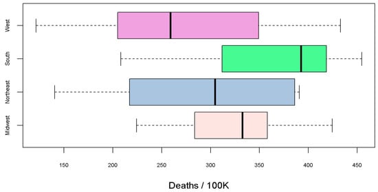 Evaluating the death rate per 100,000 people by region illustrates a higher rate in the South region and lower rate in the West region (see Figure 5). Figure 5 displays comparative patterns of deaths among the four (east, middle, mountain, and western including Alaska and Hawaii) regions of the US. A non-parametric Kruskal–Wallis (KW) test confirmed the differences (), and the Conover–Iman test found that the South and the West as well as the South and Northeast were statistically different (p = 0.003 and 0.0272, respectively). Insufficient power is available to investigate divisional differences, as one of the divisions contains only three states.