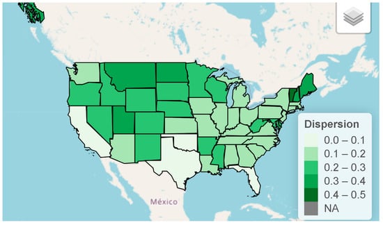 Figure 6 and Figure 7 distinguish the actual number of deaths and deaths per 100,000 residents in the four regions of the US, respectively. In Figure 6, one can see that the three states with the most deaths from 1 January 2020 to 17 April 2023 were California (101,344), Texas (92,159), and Florida (87,141). The State of New York (77,403) was not very far behind. Figure 7 allows for a death rate comparison. There is a swath of states in the middle regions of the country, from Arizona through West Virginia, which experienced a higher number of deaths per 100,000 people than the rest of the country. The reason for this phenomenon is undetermined. Figure 8 displays the pattern of overdispersion across the four regions of the US according to the biased IRRP model (4). In Figure 8, we notice the highest overdispersion (biased) in Vermont (0.474) and the lowest in California (0.090), which is exactly opposite to the total number of deaths, where Vermont was lowest and California was highest. A correlation test indicates a strong negative correlation between biased overdispersion and the number of total deaths (r = −0.725, t49 = −7.368, p < 0.001).