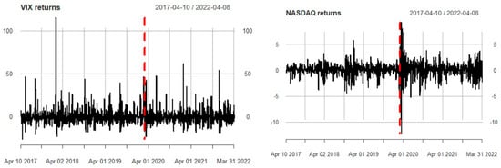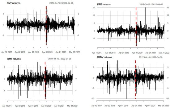 The data used in the analysis comprise the daily returns of Pfizer, AbbVie Inc., Sanofi, Bristol Myers Squibb, V.I.X., and NASDAQ. They contain 1052 observations from 6 February 2018 to 8 April 2022. The analysis uses pre-COVID-19 (from 6 February 2018 to 10 March 2020) and COVID-19 (from 11 March 2020 to 8 April 2022) periods. The sample was split on the day of WHO’s official declaration of COVID-19 as a pandemic on 11 March 2020, and the data from that day onwards were considered to be part of the COVID-19 period for analysis. The two samples were chosen to be equal in terms of observations. The data were extracted from Yahoo Finance.