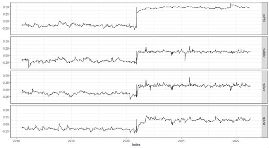 In the initial phase of the analysis, the volatility of the returns of the four pharmaceutical companies was examined using univariate GARCH models. These models revealed a consistent first-order autoregressive structure, denoted as AR(1), indicating that the stock returns from the previous day have a significant influence on the returns of the current day. The empirical findings consistently indicated that the GARCH (1,1) model was the most suitable choice for capturing the volatility dynamics of all of the return series (Table A1 from Appendix A).