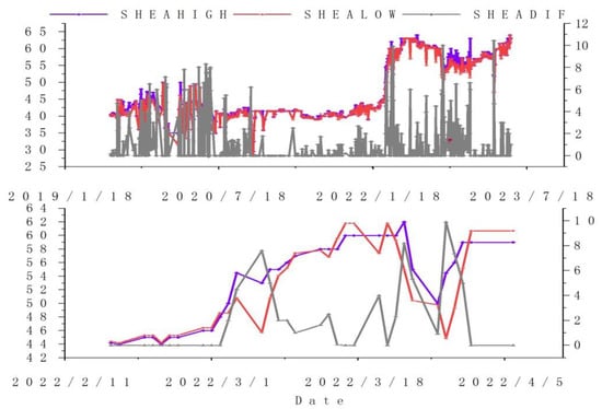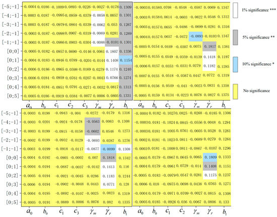 - Ex post window. It can be seen from Figure 10 that the estimators of are all in the windows [0;0], [0;1], [0;2], and [0;3]. Both of them are significant, and the significance is positive, which indicates that the intra-day fluctuation range of the price of Shanghai carbon emission rights has changed significantly within three days after the incident. The insignificance in other windows means that the market can respond quickly, keeping the price volatility of SHEA stable, which is consistent with the analysis in Section 3.1.