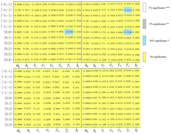- Ex ante window. As can be seen from the results of Figure 10, in both cases, in time windows [−1;−1], [−2;−1], [−3;−1], and [−1;−4], the estimator of is basically significant, which indicates that the price trend of Shanghai carbon emission rights declined four days before the city was closed. In [−1;−1], the estimators of are all significantly different from 0, and the significance shows the phenomenon of alternating positive and negative, which indicates that the intra-day fluctuation range of Shanghai carbon emission rights’ interval price changed significantly in the first days before the incident, and the fluctuation is relatively drastic, which is consistent with the analysis in Section 3.1.