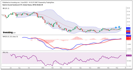 More than the graphs themselves, the recommendations of various investment sites can determine the direction of movement of the market. For example, investing.com (accessed on 16 May 2023) recommended through technical analysis to buy the BUZZ sensing EFT, which can have the effect of increasing it and inducing a positive sense of optimism in the market (Table 2):