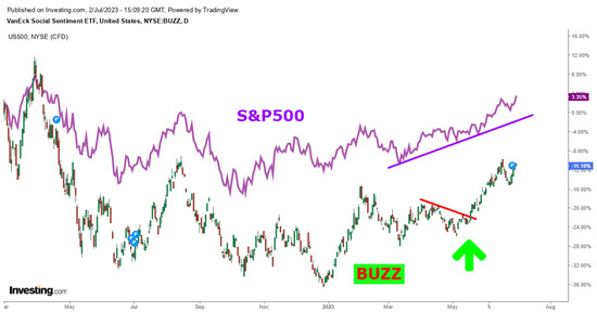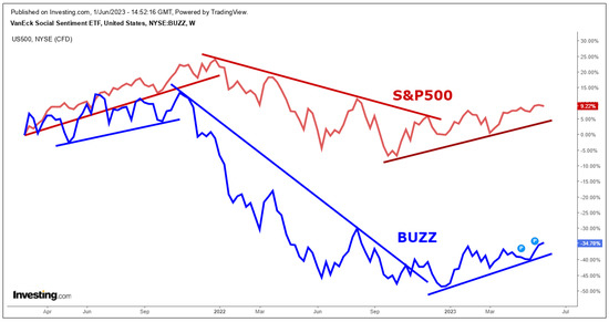 Opportunity spotted on the S&P500 vs. BUZZ comparison chart. Source: www.investing.com, accessed on 16 May 2023.