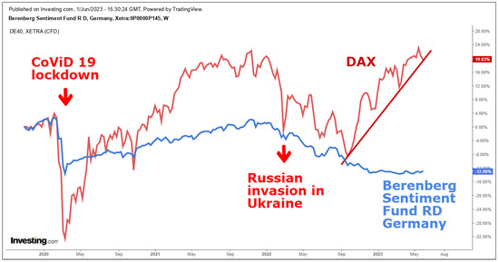 CFD sentiment in Germany vs. DAX. Source: www.investing.com, accessed on 16 May 2023.