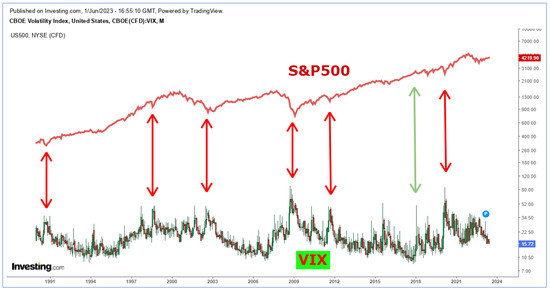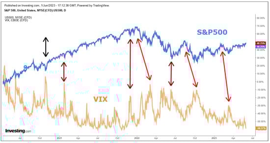 VIX vs. S&P500 (logarithmic graph). Source: www.investing.com, accessed on 16 May 2023.